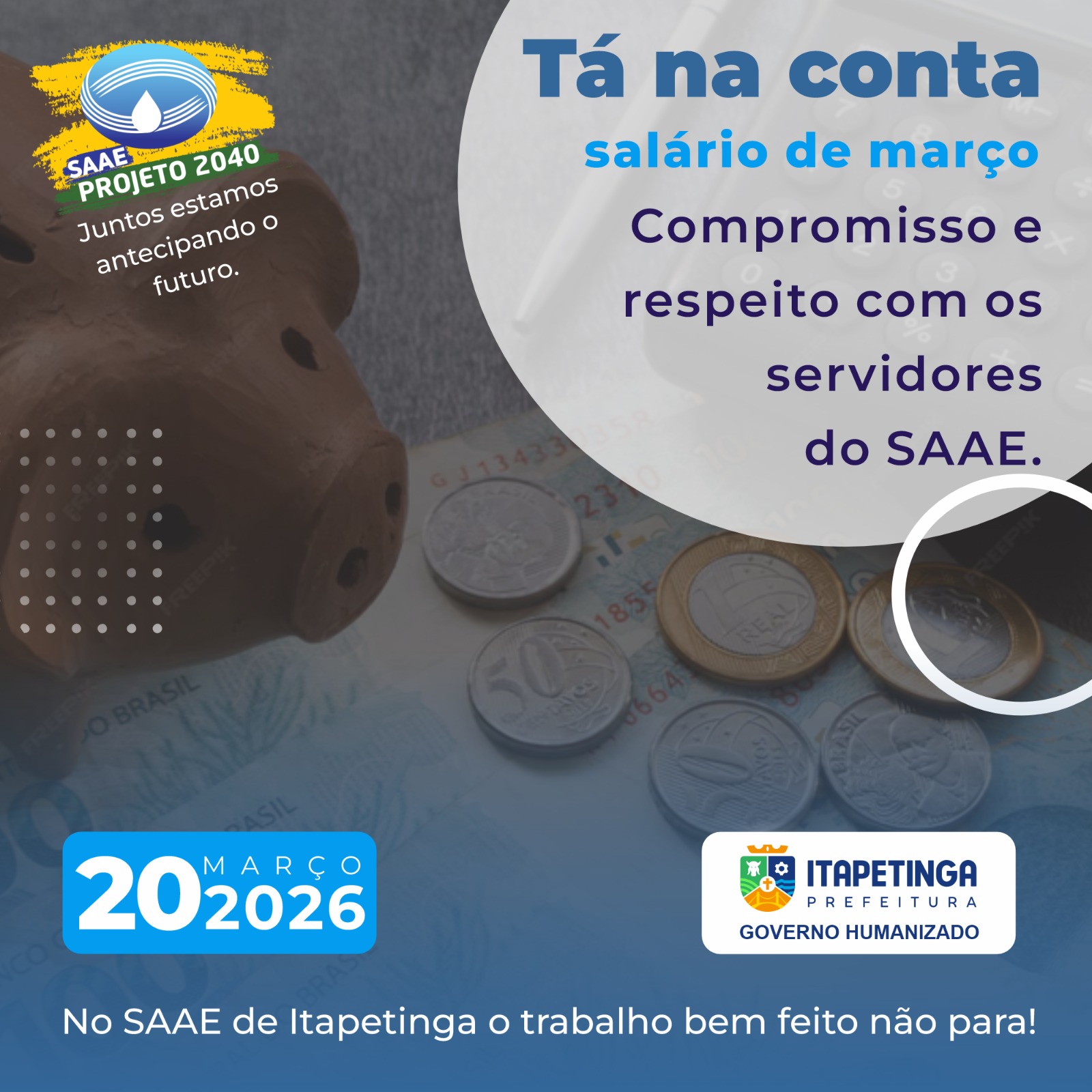 O SAAE de Itapetinga confirmou o pagamento dos salários referentes ao mês de março de 2026, garantindo mais uma vez o compromisso com a pontualidade junto aos seus servidores. Este já é o terceiro mês do ano com os vencimentos creditados dentro do prazo, reforçando a responsabilidade administrativa da autarquia.