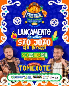 Com o tema “Lançamento do melhor São João do Brasil”, a festa promete animar o público com muita música e cultura nordestina. A principal atração da noite será o grupo Tomexote, que trará um repertório repleto de forró autêntico para aquecer os corações e antecipar o clima de São João.