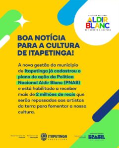 A nova gestão do município acaba de concluir o cadastro do Plano de Ação da Política Nacional Aldir Blanc — a PNAB — e está oficialmente habilitado a receber, neste e nos próximos anos, mais de 2 milhões de reais para investir diretamente na cultura local.