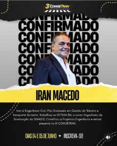 Um dos palestrantes foi Iran Macedo, engenheiro civil, pós-graduado em Gestão de Trânsito e Transporte Terrestre, com vasta experiência na área. Iran já atuou no DETRAN-BA, foi engenheiro de sinalização da empresa Sinales, e atualmente está à frente da Projetan Engenharia, empresa especializada em soluções para o trânsito.