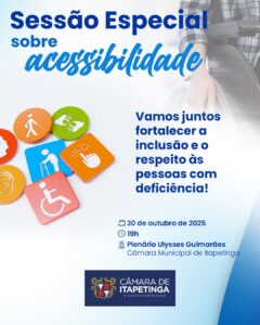 Com o objetivo de promover o diálogo, fortalecer a inclusão e garantir o respeito às pessoas com deficiência, a Câmara Municipal de Itapetinga realizará, no próximo dia 30 de outubro de 2025, às 19h, uma Sessão Especial sobre Acessibilidade.