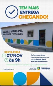 A Prefeitura de Itapetinga, sob a gestão do prefeito Eduardo Hagge e do vice-prefeito e secretário de Educação Alécio Chaves, segue investindo fortemente na melhoria da rede municipal de ensino. Nesta sexta-feira, dia 07 de novembro, às 9h, será realizada a inauguração da reforma e entrega de novos equipamentos da Escola Rural Ana Maria Fernandes, fortalecendo o compromisso da administração com a qualidade da educação no município.