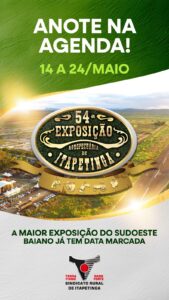 A maior vitrine do agronegócio do Sudoeste baiano já tem data marcada. A 54ª Exposição Agropecuária de Itapetinga será realizada no mês de maio de 2026, consolidando mais uma vez o município como referência no setor agropecuário da Bahia.