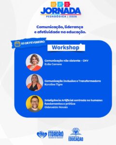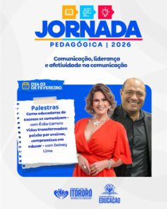 A Prefeitura de Itororó, por meio da Secretaria Municipal de Educação, realizará no dia 03 de fevereiro a Jornada Pedagógica 2026, com o tema “Comunicação, liderança e afetividade na educação”. O evento marca o início do ano letivo e reforçou o compromisso do Governo da Cidadania com a valorização dos profissionais da educação e a melhoria contínua do ensino no município.